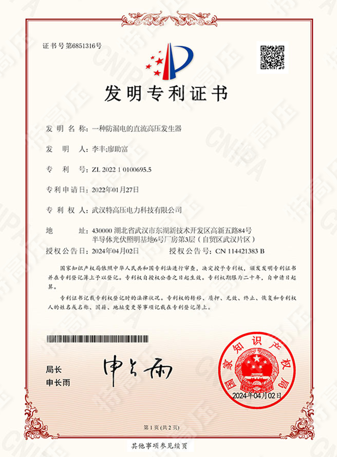 科研創新!武漢特高壓防漏電直流高壓發生器專利申請成功