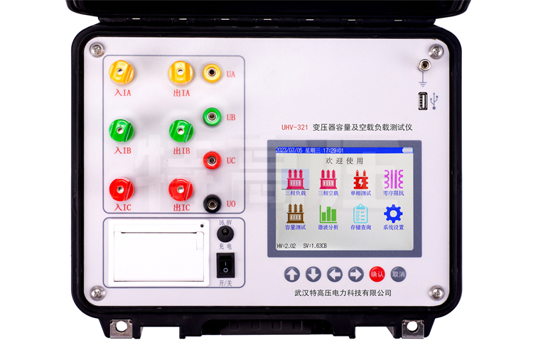 - 6、容量的測量:儀器內(nèi)置可充電鋰電池,本身可輸出三相正弦波逆變電源,輸出電壓自動(dòng)調(diào)節(jié),具有軟啟、軟停功能,無需任何外部電源可實(shí)現(xiàn)配電變壓器容量的測量和型號(hào)的判斷,同時(shí)顯示變壓器阻抗電壓和折算到額定溫度、額定電流下的負(fù)載損耗。