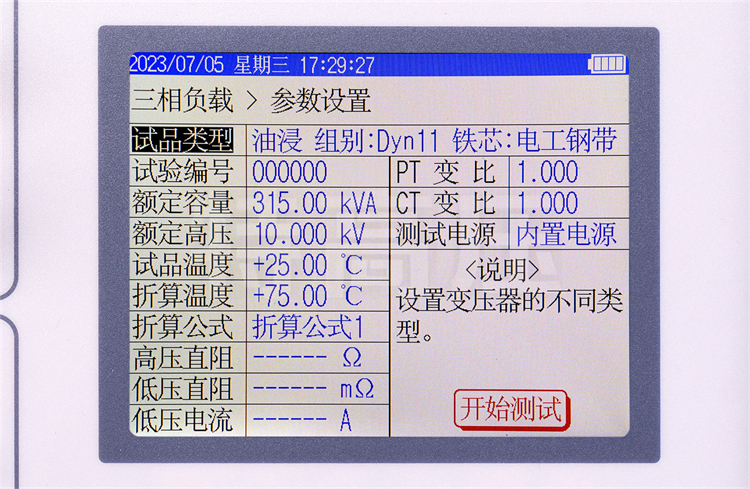 - 1、負(fù)載損耗的測量:顯示三相電壓、三相電流、三相功率,自動(dòng)計(jì)算出變壓器的阻抗電壓百分比,折算到額定溫度、額定電流下的負(fù)載損耗,自動(dòng)判斷出油浸式或干式配電變壓器的鐵芯型號(hào),測試過程中具有報(bào)警自適應(yīng)提示功能,方便現(xiàn)場用戶使用。