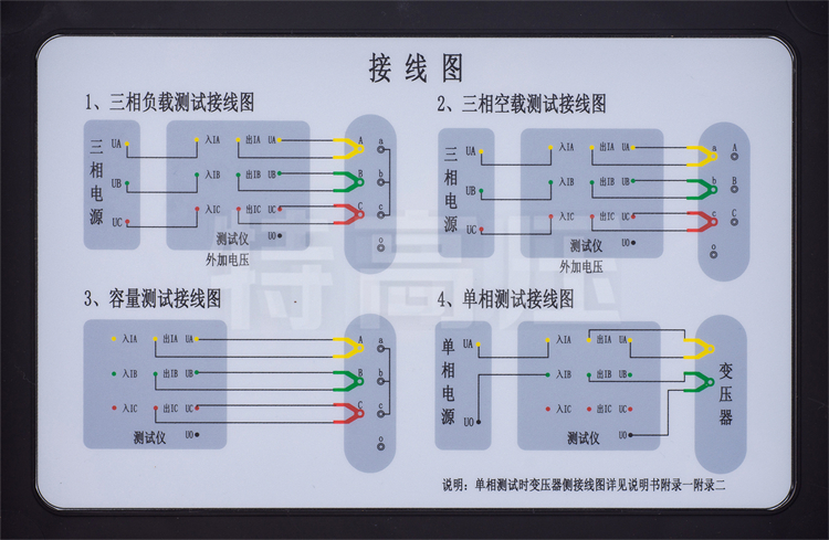 - 4、單相的測量:可用于檢查變壓器單相的缺陷或用于現(xiàn)場無三相電的情況。儀器可記錄三次單相測量的數(shù)據(jù),并可根據(jù)變壓器不同的聯(lián)結(jié)方式計(jì)算出變壓器的空載電流、空載損耗、阻抗電壓和負(fù)載損耗。