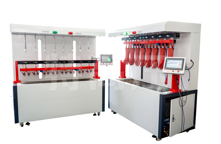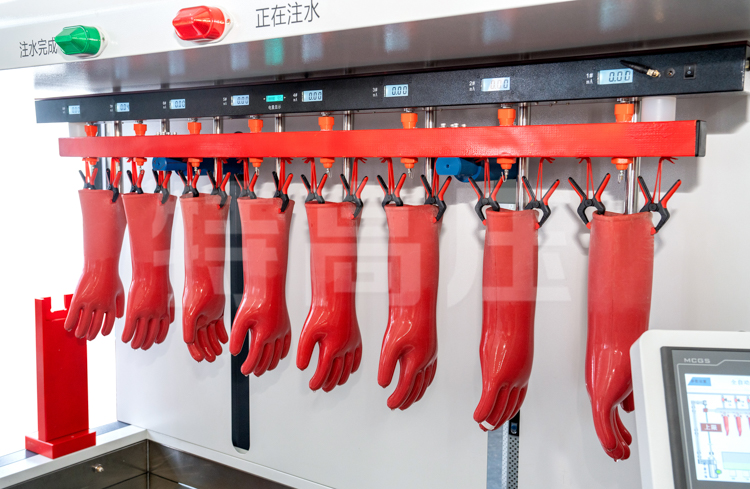 - 2、絕緣手套試驗時,注水采用全自動注水方式,試驗人員只需按要求安裝好手套,在注水裝置的設置界面中選擇絕緣手套的級別后,注水裝置依據《DL/T1476-2015電力安全工器具預防性試驗規程》、《GB/T17622-2008帶電作業絕緣手套》等自動設定手套袖口到水面的距離后注水,待水套注水完成后,注水裝置向水槽內注水,最終保證手套內外水面一致。