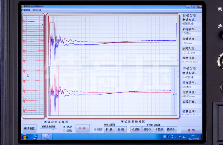 - 4、軟件實現低壓脈沖、多次脈沖法全自動識別搜索,波形故障拐點自動卡位,故障距離儀器自動讀取并顯示,,同屏三區顯示波形, 同屏隨機顯示十個低壓脈沖波形供選擇,同時實現自動和人為處理兩種模式 ,使得對波形實現雙重卡位操作,雙游標移動可精確到0.15米,提高粗測精度,減少波形誤差。