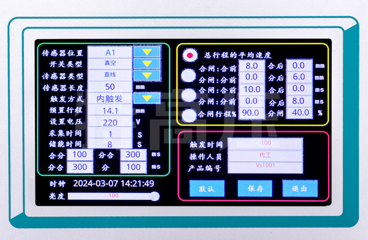- 2、7寸彩色高亮屏(亮度可調(diào)節(jié)),太陽底下操作也清晰可見。菜單式操作,快速測試界面,一鍵操作,支持中英文輸入。12路斷口狀態(tài)中文顯示,時間、行程、速度及波形同屏顯示,無需翻頁查看數(shù)據(jù)。分析指定段平均速度,并在行程曲線標(biāo)出,方便查看。內(nèi)置21種常規(guī)類型斷路器速度定義,只需選擇開關(guān)類型,一鍵測量。