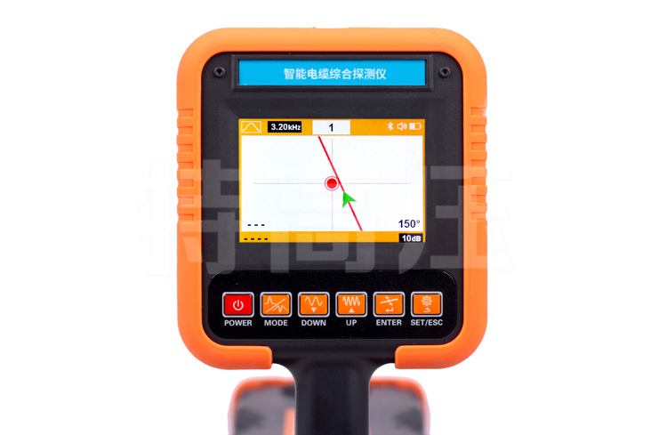 - 9、接地故障查找(選配功能):發射機發射定位信號至故障線纜,使用A字架(標配)可定位管線的接地故障定位點,箭頭指示定位方向。