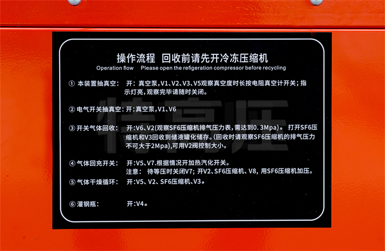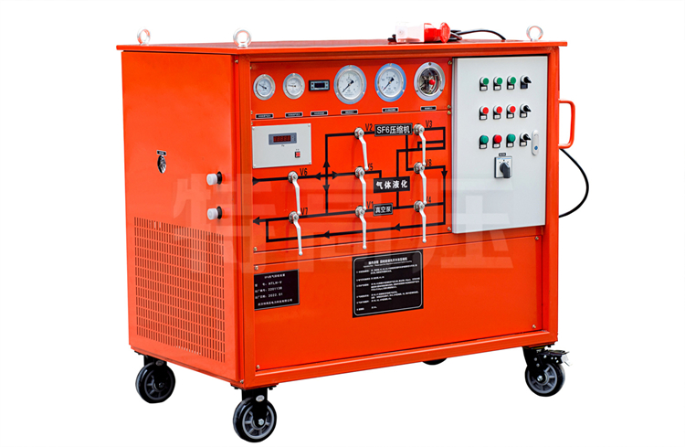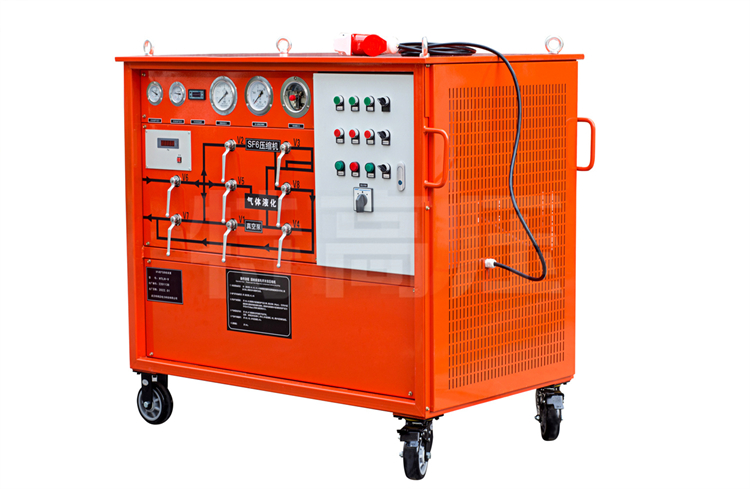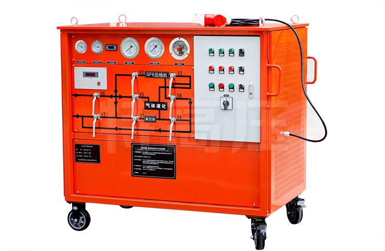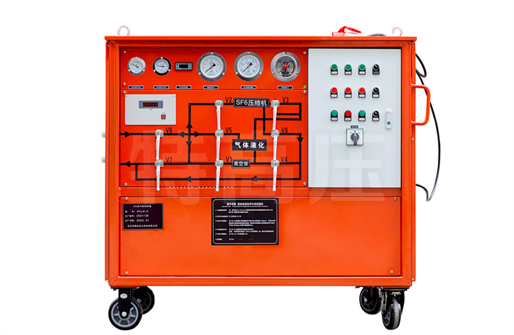 SF6 氣體作為一種絕緣氣體,具有無毒、不可燃,以及良好的絕緣特性,其絕緣強度大大高于傳統的絕緣氣體,并具有良好的滅弧性,因此廣泛應用于SF6電器。由于 SF6 氣體價格昂貴,且在電弧、電火花和電暈放電的作用下,會分解產生有毒成份。因此 SF6 電器設備應用時需要將 SF6 氣體回收。本裝置就是為了制造和維修 SF6 電器設備時,回收和充加 SF6 氣體的一種專用設備。