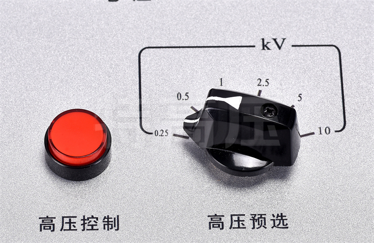 - 4、高壓輸出范圍寬廣:可選擇0.25kV、0.5kV、1kV、2.5kV、5kV、10kV,也可從0V平滑調(diào)節(jié)到需要的電壓。