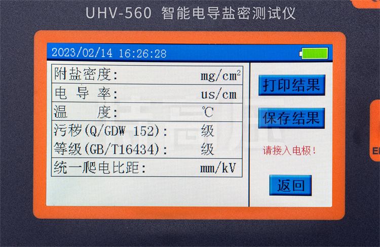 - 5、可直接顯示并打印鹽密度、電導率、溫度、污穢等級、統一爬電比距