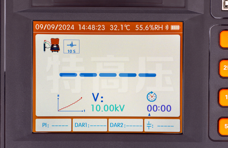 | 功能 | 絕緣電阻測試、試品電容測試、極化指數和吸收比的自動計算、自動放電功能、濾波功能、時鐘功能、外部電 壓測試、步進電壓測試、電介質放電測試 | ||